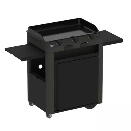 Ensuite, le chariot possède plusieurs espaces de stockage : il est possible de ranger la bouteille de gaz sous la plancha, 2 tablettes latérales permettent de déposer des produits, porte épices en façade.